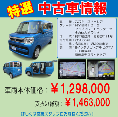 スズキ スペーシアが入庫しました!!距離少な目!車検も令和9年11月迄あって奇麗な車両です!!
